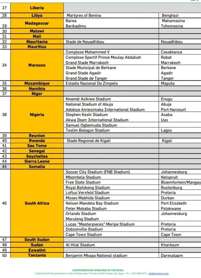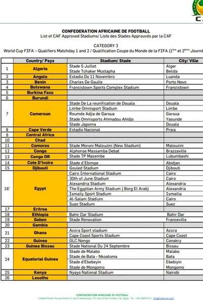 Voici la liste de tous les stades approuvés pour les 1er et 2e journées des éliminatoires zone Afrique du Mondial 2022.