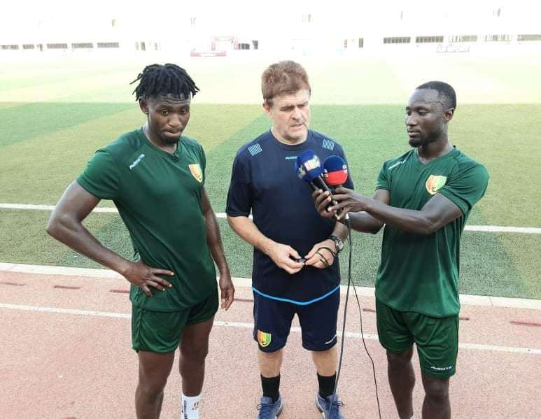Naby Keita aide la presse à interviewer Didier Six, le sélectionneur de la Guinée à Nouakchott.
