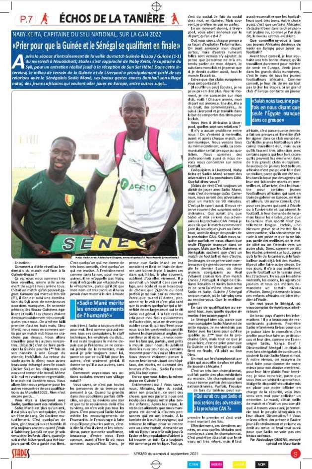 L’envoyé spécial du quotidien sportif sénégalais, Stades à Nouakchott pour la couverture du match Guinée Bissau-Guinée, comptant pour la première journée des éliminatoires du mondial 2022, a présenté un article sur Naby Keita comme le résultat d’un entretien personnalisé avec le joueur de Liverpool.